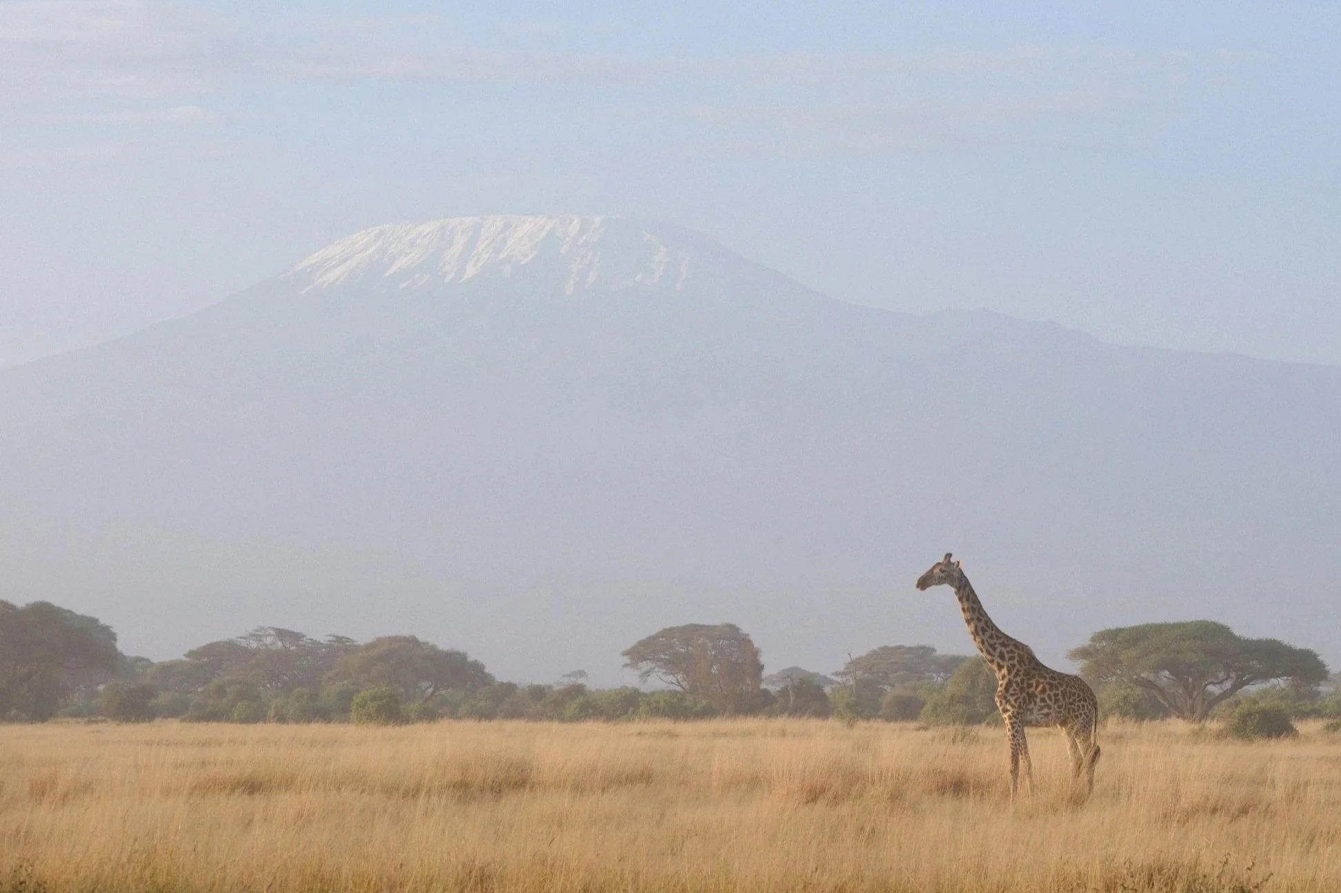 De klassieke Kilimanjaro-foto met een giraffe op de voorgrond.