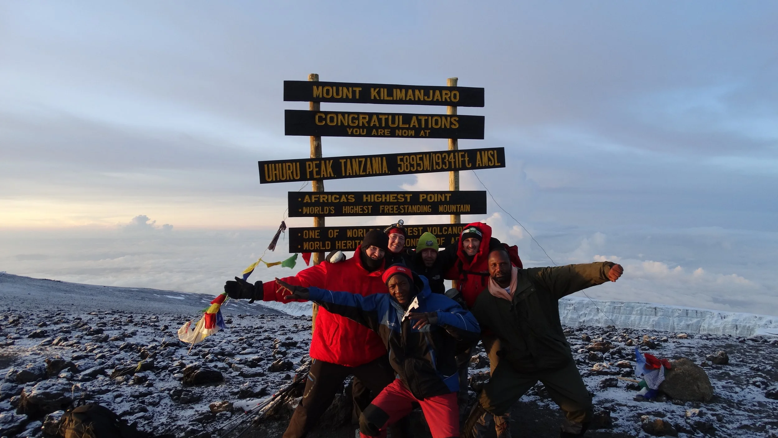 Als we om 6u32 op Uhuru Peak aankomen worden we vergezeld door de eerste zonnestralen. We hebben het gehaald! We feliciteren elkaar, we bedanken onze beide gidsen en we genieten ervan dat we de hoogste mensen van het ganse Afrikaanse continent zijn. We staan op 5895 meter hoogte. Het feit dat we ons kiplekker voelen, zonder hoofdpijn of andere symptomen van hoogteziekte, draagt alleen maar bij aan de vreugde. Even staan we stil te kijken naar de indrukwekkende metershoge gletsjers op de achtergrond. Terwijl ik over de krater uitkijk, dwalen mijn gedachten af naar mijn dierbaar gezin.